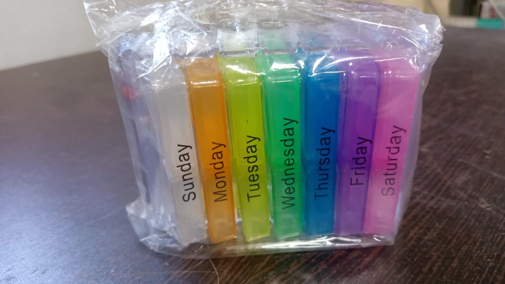 - Weekly pill box: 7 days pill organiser 4 times a day, clearly marked on the eyelids indicating the days of the week.